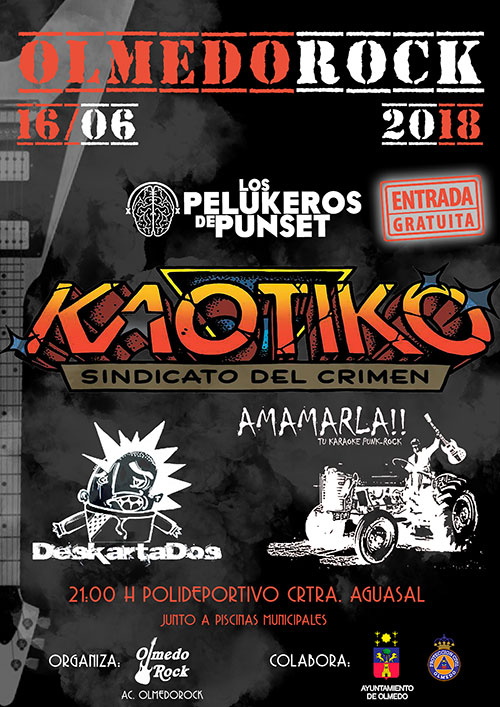 La A.C. Olmedorock presenta la XIV edición del Festival Olmedorock, que se celebrará el 16 de junio con Kaotiko como cabeza de cartel. Amamarla y Deskartados desde Valladolid, y Los Pelukeros de Punset desde Palencia, completan el cartel del Olmedorock 2018, uno de los festivales alternativos más antiguos de la región, que destaca desde su primer año por su gran ambiente musical y por la gratuitidad de la entrada. A partir de las 21:30h en las Piscinas Municipales de Olmedo (Valladolid)..